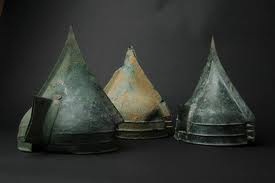 ( On peut les rapprocher d'une famille de casques utilisés en Europe centrale et en Italie au VIIIe siècle avant J.-C. Ils témoignent de la grande maîtrise atteinte par les artisans de la fin de l'âge du Bronze. musée de Normandie caen)